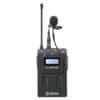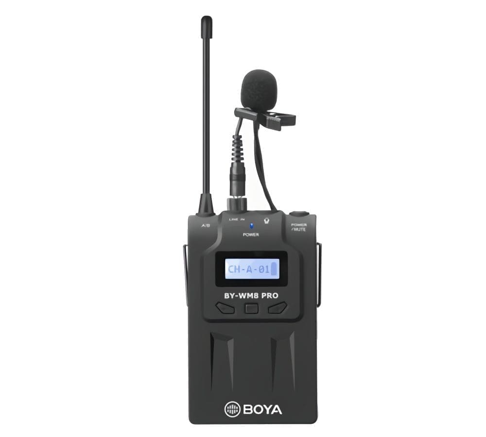 Εξαιρετικό ασύρματο UHF σύστημα μικροφώνου Το σετ BY-WM8 Pro-K1 περιλαμβάνει έναν πομπό και έναν δέκτη. Το όλο σύστημα είναι ιδανικό για DSLR, Mirrorless, Επαγγελματική βιντεοκάμερα και όλους τους τύπους φωτογραφικών μηχανών ή φορητών συσκευών εγγραφής ήχου με είσοδο μικροφώνου 3,5 mm ή XLR. Είναι ιδανικό για την καταγραφή συνεντεύξεων, κινηματογραφικών διαλόγων, ηχογραφήσεων, τηλεοπτικών εκπομπών, ειδήσεων, Vlogging, βίντεο στο YouTube και πολλά άλλα. Επαγγελματικά χαρακτηριστικά, απλά βήματα Το BY-WM8 Pro K1 χρησιμοποιεί το φάσμα UHF (Ultra High Frequency), το οποίο σας βοηθά να αποφύγετε τις παρεμβολές. Υπάρχουν 48 διαθέσιμα κανάλια, τα οποία επιτρέπουν στους χρήστες να λειτουργούν ταυτόχρονα πολλά σετ συστημάτων BY-WM8 Pro χωρίς προβλήματα. Και η εμβέλεια λειτουργίας μπορεί να φτάσει έως και τα 100 μέτρα (χωρίς εμπόδια). Το σύστημα είναι εξαιρετικά εύκολο στη χρήση και λειτουργεί αμέσως από το κουτί. Απλώς συνδέετε το μικρόφωνο, ενεργοποιείτε την τροφοδοσία και ξεκινάτε. Εύκολα αναγνώσιμες οθόνες LCD Οι ευανάγνωστες οθόνες LCD στον πομπό και τον δέκτη, σας επιτρέπουν να κάνετε γρήγορες ρυθμίσεις στα διαισθητικά μενού στα πιο φωτεινά ή σκοτεινά περιβάλλοντα. Η λειτουργία αυτόματου κλειδώματος LCD αποφεύγει το τυχαίο άγγιγμα κατά τη διάρκεια επαγγελματικών λήψεων ή κανονικής χρήσης. Oscillator type: PLL Synthesized Control Oscillator Carrier Frequency Range: 556.71 MHz-575.98 MHz (Transmitter: A ) 576.39 MHz-595.66MHz (Transmitter: B ) Channels: 48 Frequency response: 40 Hz to 18 kHz (+/-3dB) Operation range: 100 μέτρα χωρίς εμπόδια Antenna: 1/4λ wire antenna Audio input connector: 3.5mm mini jack Signal to noise ratio 70dB or more Distortion: 0.5% or less Headphone output level: 30mW(16Ω) Audio output level: -60dBV Power supply 2 AA μπαταρίες Operation time: Σχεδόν 4 Ώρες Dimensions: 208(H) × 67(W) × 29(L)mm Weight: 90g χωρίς μπαταρίες