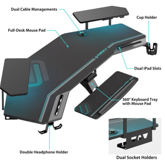 Το γραφείο gaming της εταιρείας Eureka Ergonomic διαθέτει μεταλλικά πόδια. Διαθέτει εργονομικό σχεδιασμό με στόχο να προσφέρει στον χρήστη μια ξεχωριστή εμπειρία gaming.