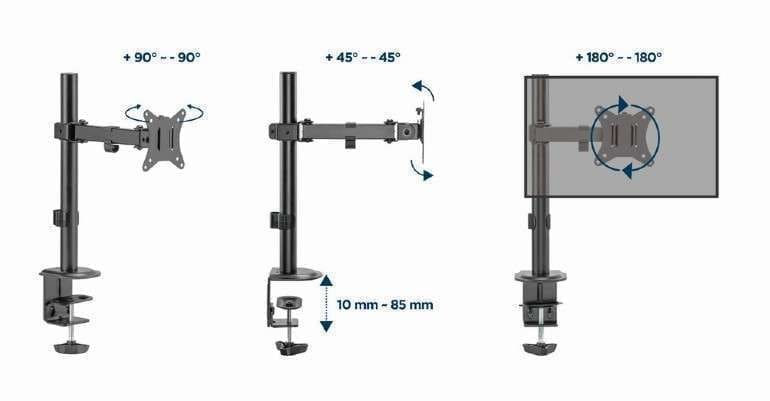 Τοποθετήστε την οθόνη σας τέλεια για βέλτιστη εργονομική θέση Συμπαγής λύση εξοικονόμησης χώρου Επιτραπέζια βάση οθόνης με μονό βραχίονα οθόνης Επιτρέπει την περιστροφή της κλίσης, το τράβηγμα προς τα εμπρός και την απόσυρση της οθόνης σας και επιτρέπει την περιστροφή της οθόνης από οριζόντια λειτουργία σε κατακόρυφο Λειτουργεί με σχεδόν οποιαδήποτε οθόνη LCD (μέγ. 32′ / 9 kg) Ισχυρός σφιγκτήρας ή δακτύλιος γραφείου για εύκολη και ασφαλή στερέωση στο γραφείο σας Ενσωματωμένη διαχείριση καλωδίων για οργανωμένο και προσεγμένο χώρο εργασίας Συμβατό με VESA (100 x 100 mm και 75 x 75 mm) Προδιαγραφές Υλικό: ατσάλι, πλαστικό Φινίρισμα επιφάνειας: βαφή πούδρας Χρωμα μαυρο Υποστηριζόμενο μέγεθος οθόνης: 17′ – 32′ Χωρητικότητα βάρους: 9 kg Συμβατό με VESA: 75 x 75, 100 x 100 mm Εύρος κλίσης: +45 ° ~ -45 ° Εύρος περιστροφής: +90 ° ~ -90 ° Περιστροφή οθόνης: +180 ° ~ -180 ° Εγκατάσταση: Σφιγκτήρας γραφείου ή δακτύλιος Μέγιστη. Πάχος γραφείου: Σφιγκτήρας: 10 ~ 85 mm, δακτύλιος: 10 ~ 40 mm Διαχείριση καλωδίων: Ναι Καθαρό βάρος: 2,2 kg Διαστάσεις: 116 x 308 x 561 mm