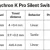 Οι διακόπτες Silent K Pro είναι κατασκευασμένοι με επαφή από κράμα χρυσού για να παρέχουν υψηλότερη αντιοξειδωτική απόδοση και να τους εγγυώνται για έως και 50 εκατομμύρια πληκτρολογήσεις.