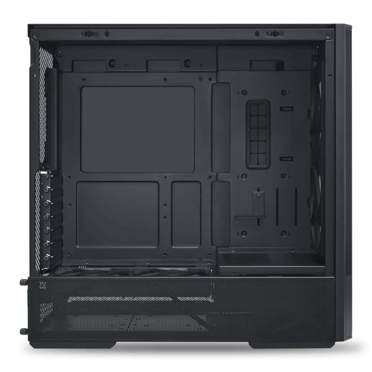 Για να επιτευχθεί αυτό, το τροφοδοτικό έχει μετακινηθεί από το τυπικό πίσω σημείο τοποθέτησης στο μπροστινό μέρος της θήκης. Με αυτόν τον τρόπο, ο θάλαμος ακριβώς κάτω από το Tray της Motherboard μπορεί να μειωθεί σε ύψος, επιτρέποντας την εγκατάσταση μιας Motherboard πλήρους μεγέθους ATX. Αυτός το μικρό Case είναι ιδανικό για την εγκατάσταση έως και δύο σκληρών δίσκων 3,5″, διαθέτει άφθονο χώρο για τη διαχείριση καλωδίων και προσφέρει άφθονη πρόσβαση σε καθαρό αέρα για ψύξη. Επιπλέον, αυτό δεν έχει καμία επίπτωση στο ίδιο το case του τροφοδοτικού, το οποίο συνεχίζει να διαθέτει συμβατότητα με τροφοδοτικά ATX μήκους έως 160 mm.
